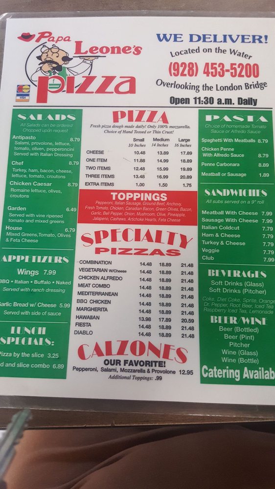 Welcome to Papa Leone's Pizza, your go-to destination for authentic Italian dining in Lake Havasu City, AZ. Nestled in Suite 304, this charming establishment boasts a diverse menu that will elevate your culinary experience.